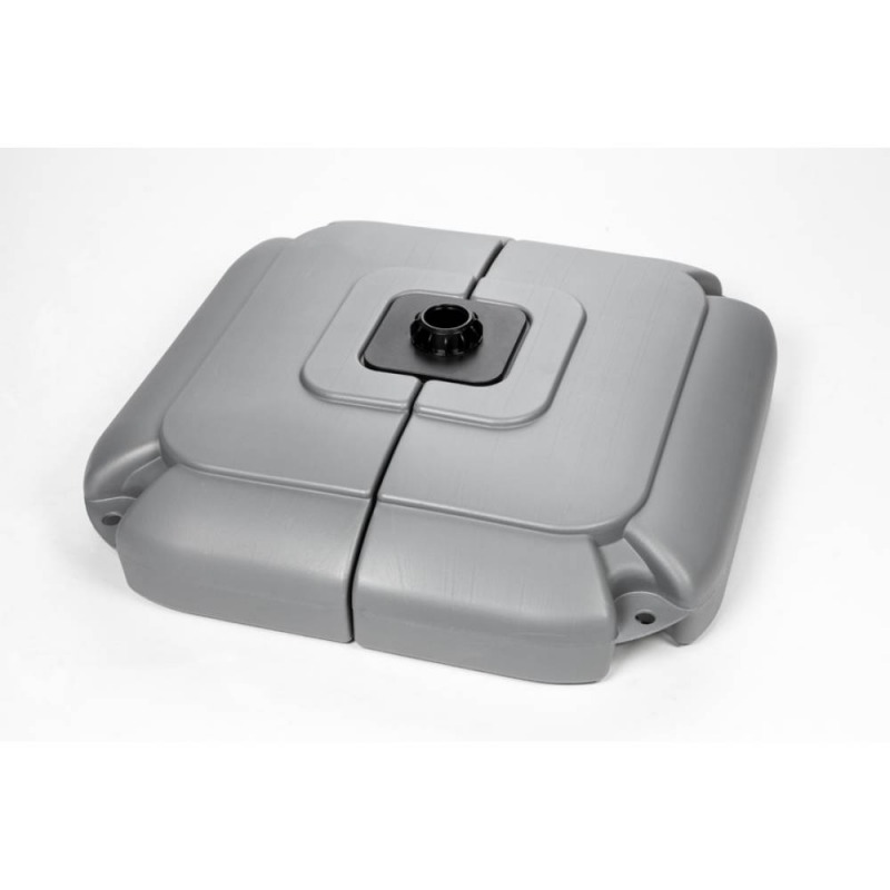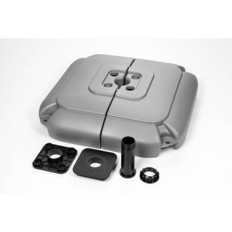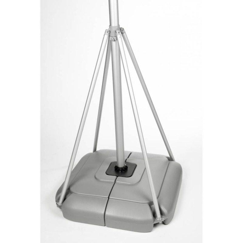 Le mât télescopique en aluminium est planté dans socle réservoir d'eau d'une capacité de deux fois 40L. La potence au sommet du mât maintient le drapeau de façon à assurer la complète visibilité du drapeau. Les 4 tiges de support répartissent les effets du vent sur la base et préviennent le renversement.