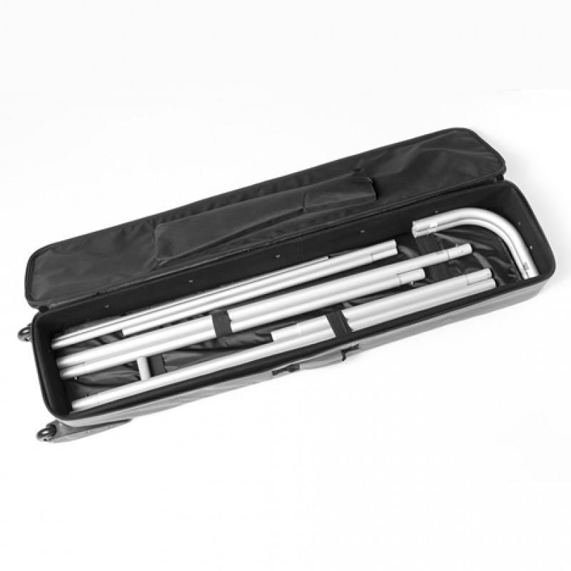 Pour une utilisation durable, le mur d'images est livré dans sa valise de transport rigide sur roulettes.
